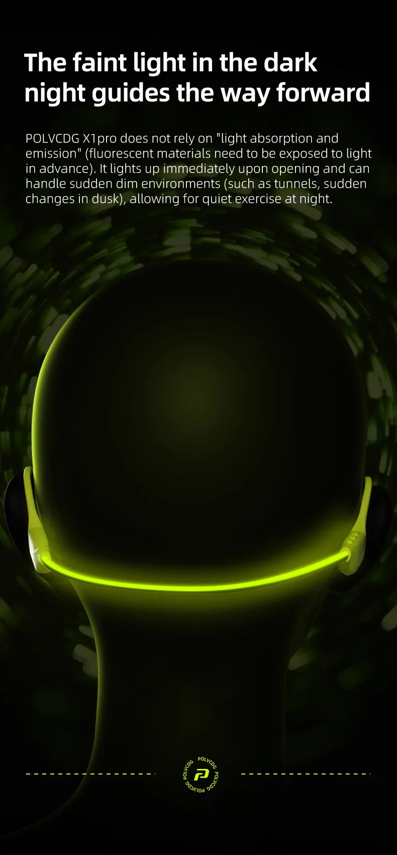POLVCDG X1pro does not rely on "light absorption and emission" (fluorescent materials need to be exposed to light in advance). It lights up immediately upon opening and can handle sudden dim environments (such as tunnels, sudden changes in dusk), allowing for quiet exercise at night.