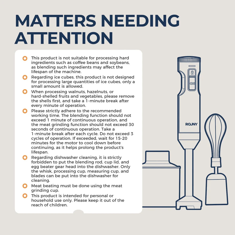 ROUNY electric hand mixer has a powerful 1000W copper motor. The high-precision, German-designed motor has balanced power and long-lasting durability. It makes mixing tasks easier and faster with less noise.